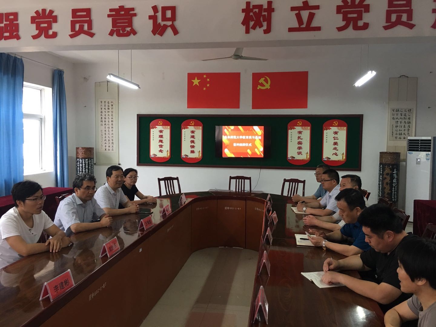 副院长王海龙与时庄中学校长朱明新代表双方签署合作协议,并为教育实习基地揭牌。曲阜市教师教育中心高中部主任王德才,时庄中学教务处与年级部领导及教师代表,NT动漫