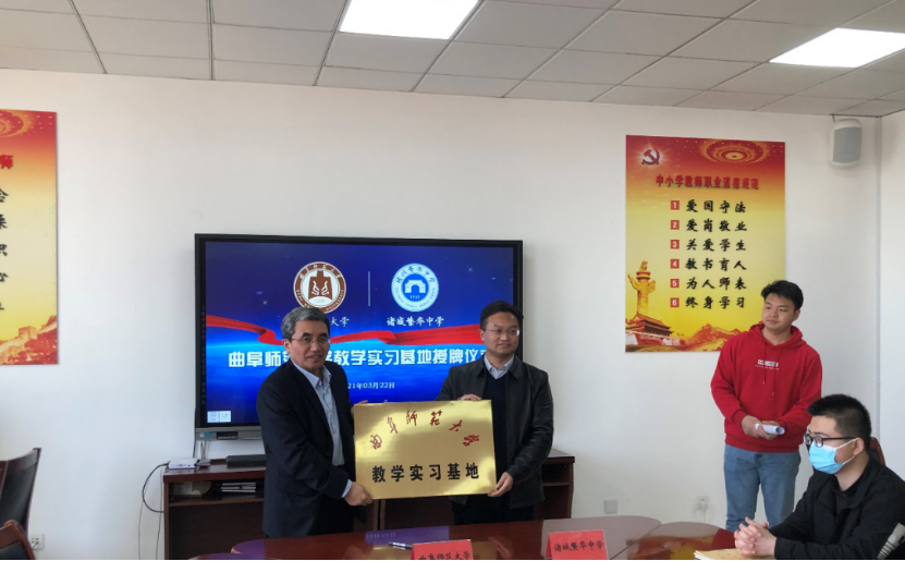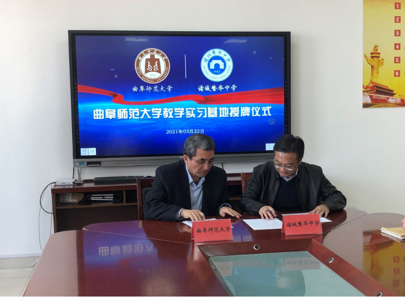 王海龙副院长和郑伟明校长代表双方学校签署实习协议,共同为曲阜师范大学教学实习基地揭牌。