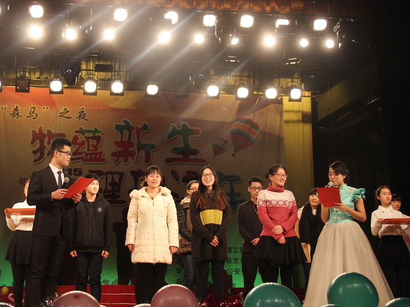 老师和同学们一年来取得的成绩的同时,也表达了对2015级新同学的真挚祝福与期望。晚会节目精彩纷呈,歌曲、小品、相声、舞蹈、创意走秀、乐队表演等一一呈现在观众眼前。歌曲串烧《青春之路》向大家诉说青春的点滴感动;一首《Loser》带动了全场气氛,燃起了同学们的斗志,青春不怕失败;小品《男生宿舍那些事》以宿舍为题材,从身边小事出发,令人开怀大笑又不失温馨感动,引发台下观众共鸣。中场互动环节,工作人员为同学们准备了饺子;大家积极参与微信互动,现场气氛活跃。王梅老师作为代表发言,对同学们表示祝福。亲切的话语,热乎的饺子,让离家在外的学子倍感温暖。而后2015级军训教官深情演唱《至少还有你》,让同学们重拾军训那段充满汗水与收获的时光。最后,晚会在掌声与乐曲旋律中圆满结束。