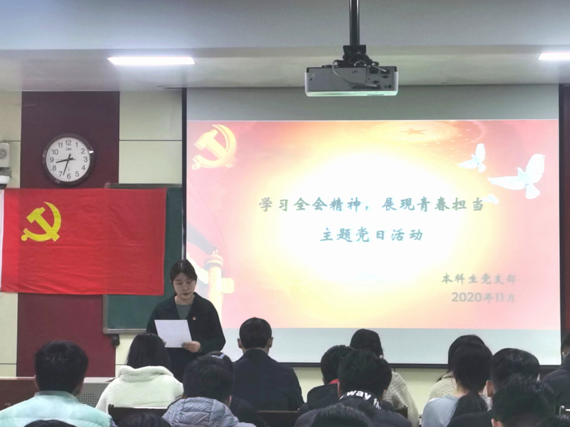活动伊始,颜冲对中国共产党第十九届中央委员会第五次全体会议背景等内容进行介绍。全体与会党员在戴润洲同志的带领下共同学习了第十九届五中全会会议公报。随后,与会党员纷纷发言,围绕十九届五中全会内容并结合自身实际分享感悟体会。活动最后,王琼进行总结,强调本科生党支部接下来的工作重点是让党员身份亮起来、让党员管理严起来、不断创新党员教育活动形式,希望全体党员以党支部入选学校党建工作样板支部为契机,进一步加强自身学习,为党支部建设规范提升工作贡献力量。
