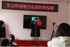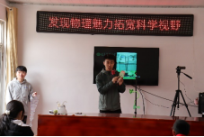 22日清晨6点,由指导老师孟祥省、韩士轩、郑萌萌、周留柱4位老师和12名学科教学(物理)专业研究生组成的科普团队从曲阜乘车出发,满载着科普道具,经过三个多小时的车程,到达莒南县坊前镇坡木村党支部大院。村里同学们早已坐满了党支部会议室,热情期待着活动开始。团队老师和研究生们有条不紊,很快完成准备工作。本次科普活动准备了15个实验,包括声、力、气、水四个单元,有演示实验、边学边做实验、体验实验和室外活动等多种形式。经过一个简单的开场,科普活动正式开始。