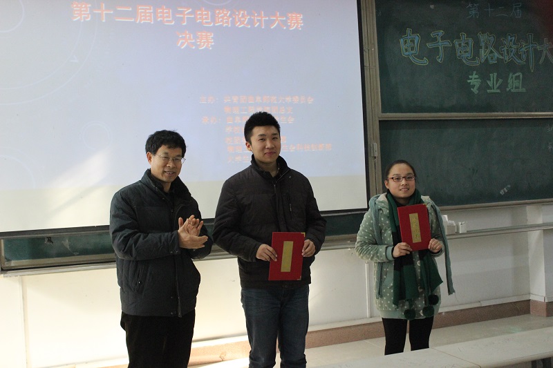 专业组决赛正式开始,参赛选手利用幻灯片介绍自己作品的设计原理、使用方法,并进行成果展示。评委老师对十组选手的作品进行指点打分。赵建平就本场比赛进行点评,高度肯定了同学们的能力。刘新提出希望同学们在展示的过程中突出自己的闪光点。比赛结果最终揭晓,杨雪一组的“电能消耗计量装置”、孙大鹏一组的“LED照明灯设计”荣获一等奖,总裁判赵建平为他们颁奖。