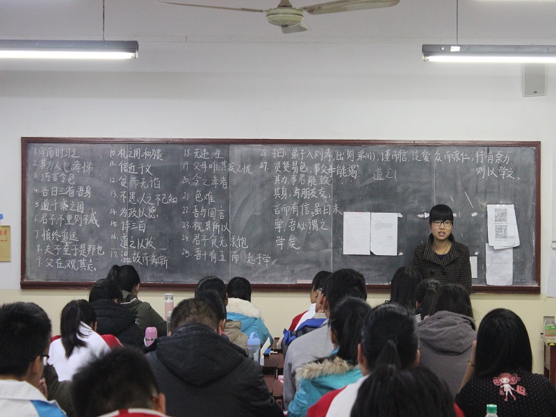 活动伊始,由孙金杰向各班负责领读的同学讲解诵读内容,并结合实际向同学们讲解经典名句所蕴含的道理及其所表达的意义。随后,各班领读将诵读内容誊写在黑板上并为同学们进行讲解。在每日早、晚自习的前5分钟各班同学都在领读的带领下齐声诵读经典名句。