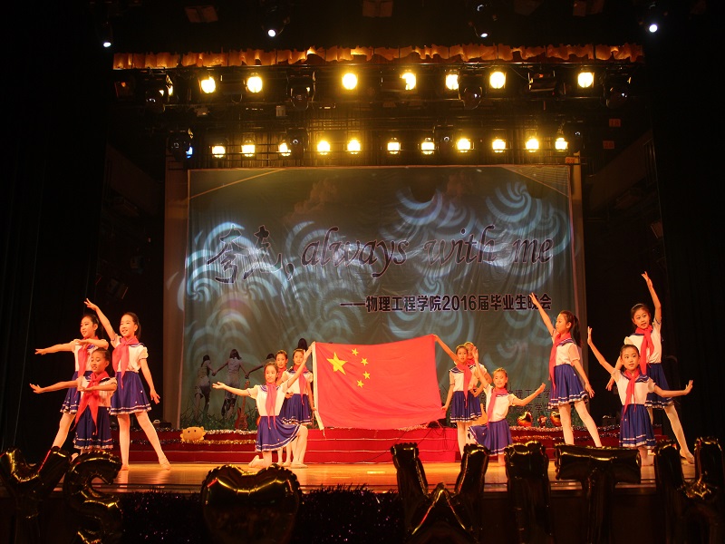 晚会伊始,凝结了四年点滴的开场视频记录下毕业生对母校的眷恋和对大学生活的感想。精彩的开场舞表演后,晚会正式拉开帷幕。儿童节目《红领巾相约中国梦》令人眼前一亮,孩子们的纯真可爱给观众留下深刻印象;花样跳绳《Luck With You》中高难度的花样跳绳将团队之间的协作体现的淋漓尽致。中场互动中,主持人念出毕业生们在留言墙上的温馨留言,表达对母校的不舍与祝福。随后,《物院版小幸运》使人耳目一新,NT动漫