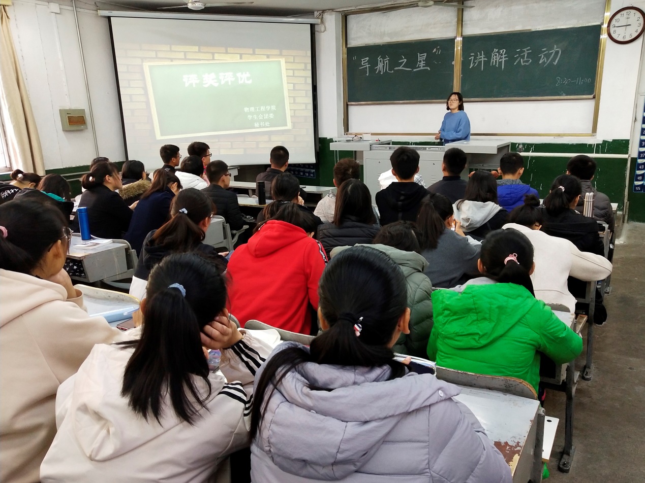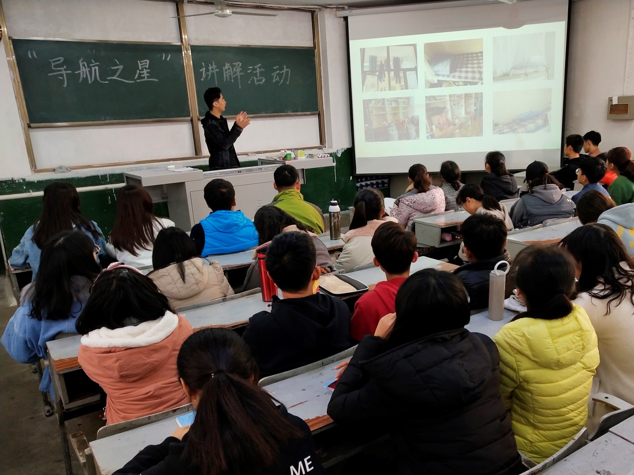 团委主办,学生会权益部、卫生部、纪检部、秘书处及宿管部共同承办的“导航之星”讲解活动在院楼四个阶梯教室同时举办,2018级全体同学参加本次活动。