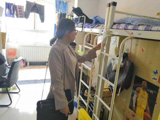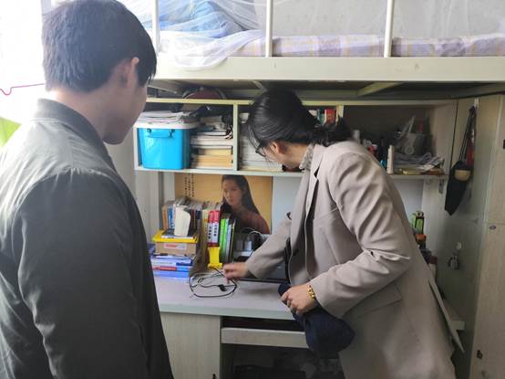在走访过程中,老师对学生宿舍用电、安全通道和卫生等方面进行了检查,严格按照规章制度,对存在安全隐患的宿舍指出问题,并给出整改意见。王琼老师向同学们强调了安全用电的注意事项,提醒同学们时刻注意人身安全、财产安全、交通安全和饮食安全。针对同学们提出的问题,老师给予相关建议并要求学生干部们尽快着手解决,及时作出答复。
