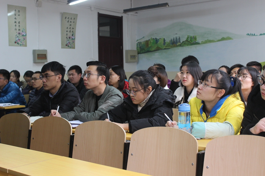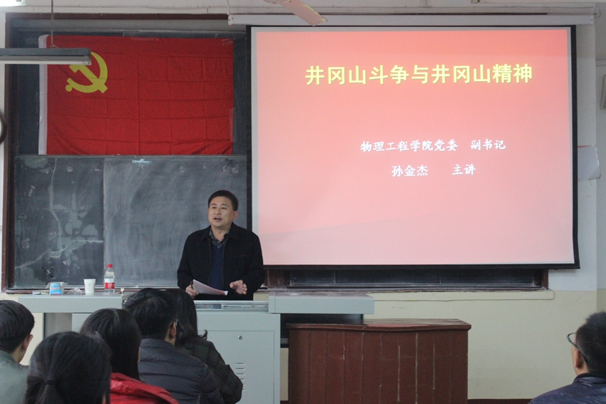 副书记孙金杰根据近期去井冈山革命老区接受红色教育的经过和感受,围绕井冈山斗争与井冈山精神,并结合十九大精神进行了讲解。他首先简要回顾了中国共产党的成立和早期发展过程中的艰苦探索,随后他从井冈山根据地的斗争概况、井冈山革命的历史地位以及井冈山精神的形成三个方面概述井冈山的精神内涵。孙书记指出,井冈山斗争在中国革命史中的历史地位和作用,第一是建立了全国最为成功最为典范的第一块农村革命根据地,为当时全国各地根据地的建设发挥了“星火燎原”般的作用;第二是找到了一条中国式的革命道路,那就是农村包围城市,武装夺取政权;第三就是第一次提出了我党“在斗争中创造新局面”的思想路线:没有调查,便没有发言权;反对本本主义;要取得中国革命的胜利,必须依靠熟悉中国国情的中国同志;第四在于第一次解决了农民的土地问题,《井冈山土地法》成为我党在民主革命时期制定的第一部土地法;第五是井冈山斗争期间第一次积累了党、政、军建设的丰富经验,初步确立了党对军队的绝对领导。
