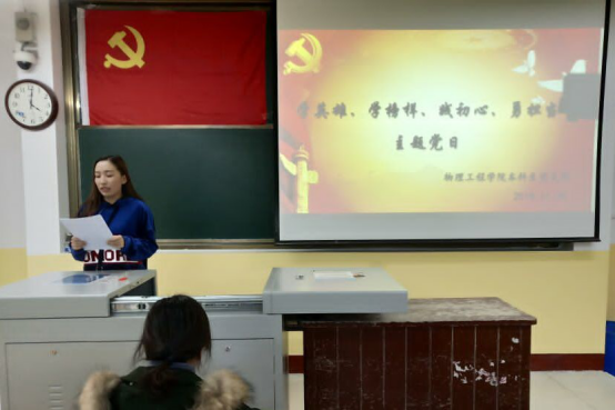 活动伊始,党支部书记王琼向与会党员传达了上级部门关于“学英雄、学榜样、践初心、勇担当”的文件内容。她表示:作为党员要做好带头作用,认真学习贯彻习近平总书记的重要指示精神,广泛开展向黄群、宋月才、姜开斌同志为代表的抗灾抢险英雄群体和王继才同志的学习工作。随后,2016级党小组组长高琳然对黄群等同志的先进事迹进行了主要讲解和阐述。最后,与会党员认真观看和学习了《榜样3》专题节目。