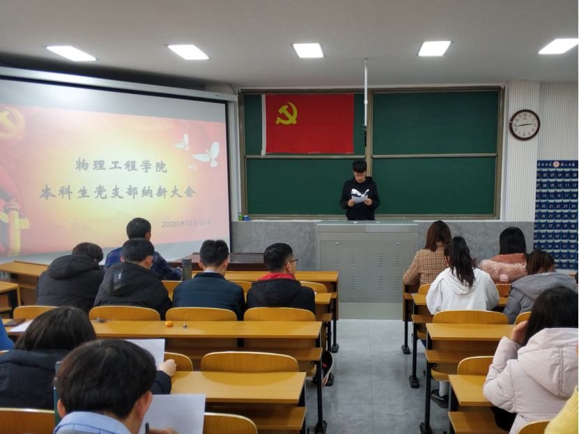 12月16日下午,学院本科生党支部于物理楼三阶一教室召开党支部纳新大会。本科生党支部书记王琼,辅导员李爱国、颜冲、孔瑞、邱金芝出席会议,本科生党支部全体党员及发展对象参加。本次会议由组织委员颜冲主持。