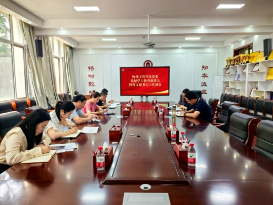 在物理楼225会议室召开党纪学习教育推进会暨党支部书记工作例会。党委书记于健、党委副书记王琼、党委组织员孔瑞及各党支部书记参加会议。