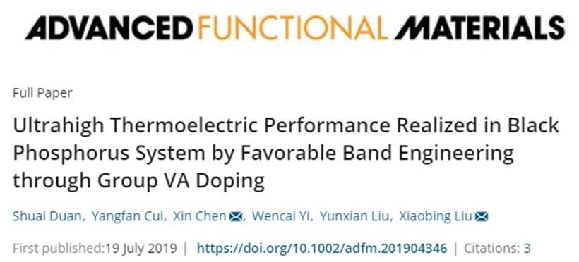 本研究工作发现pBiP7的最优室温ZT可以达到1.21nNP3的最优ZT可以达到0.87。相关论文以题为“Ultrahigh thermoelectric performance realized in black phosphorous system by favorable band engineering through group VA doping”发表在国际材料科学顶刊Adv. Funct. Mater.上(SCI一区TOP期刊,影响因子16.836),2018级硕士研究生段帅为文章第一作者,陈欣教授与刘晓兵教授为文章通讯作者。