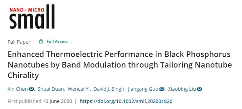 为了充分利用黑磷层内热电转化效率各向异性这一独特优势,该团队探索载流子传导的不同取向以得到最佳的热电输运性质,构建了沿不同晶轴 (1,0)(0,1)(1,1)(1,2)(2,1) 取向的黑磷纳米管。通过计算发现,黑磷纳米管的电子结构与晶轴取向之间存在强烈的依赖关系,沿 (1,1) 晶轴取向纳米管的表面电子态沿轴向分布,电子结构具有多能谷的能带特征,有利于电输运性能的提升。进一步计算分析发现,纳米管结构的载流子迁移率在室温下可达 2430 cm2V-1s-1,约为黑磷烯的2.5倍,室温热电优值相比黑磷约提高了一个数量级。相关论文以题为“Enhanced thermoelectric performance in black phosphorus nanotubes by band modulation through tailoring nanotube chirality”发表在国际材料科学顶刊Small上(SCI一区TOP期刊,影响因子11.459),陈欣教授为文章第一作者,2018级硕士研究生段帅为文章第二作者,刘晓兵教授与陈欣教授为文章通讯作者。