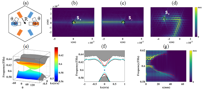 图1 (a)光子晶体单元结构。(b)和(c)为不同手性源激励下无能隙边界态电场强度分布。(d)电磁波沿含有60°拐角的边界传输电场分布,激励源与(b)相同。(e)体态与边界态能带色散,灰色曲面为体态,彩色为边界态。(f)有能隙边界态与拓扑角态色散,蓝色实心点为角态,黑色、蓝色、红色曲线为边界态,灰色区域为体态。(g)拓扑彩虹捕获器电场沿界面的分布。