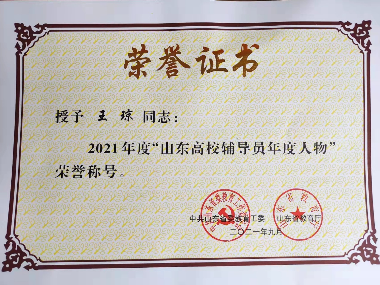 辅导员王琼荣膺此称号。