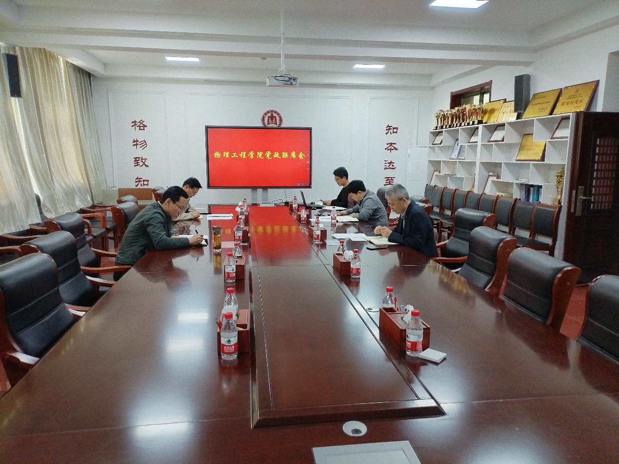 在物理楼225会议室召开党政联席会议,学院党委书记于健、院长满忠晓、副院长张英杰、副院长刘广强参加了会议。