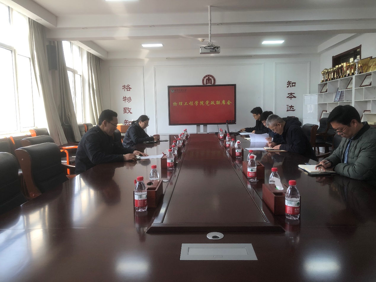在物理楼225会议室召开党政联席会议,学院领导班子全体成员参加了会议。